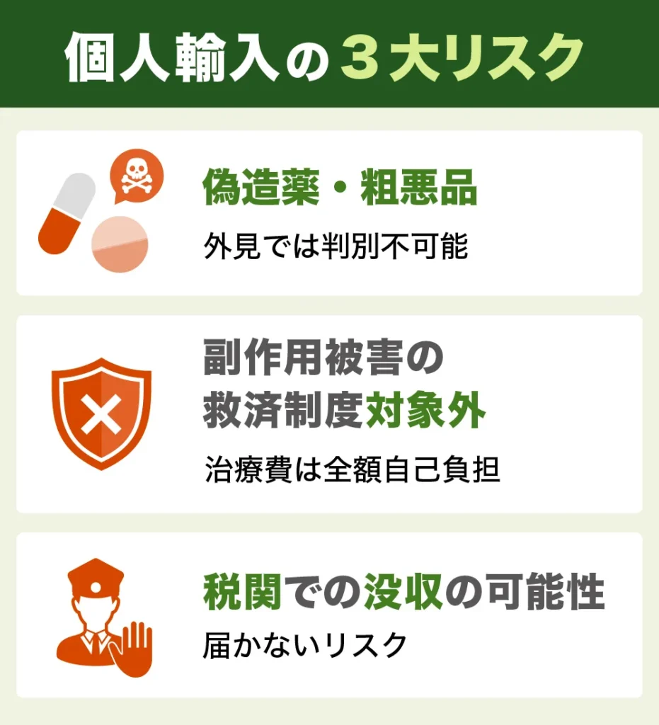 個人輸入自体は違法ではありませんが、医師の処方を受けずに購入する場合は、すべて自己責任となります。