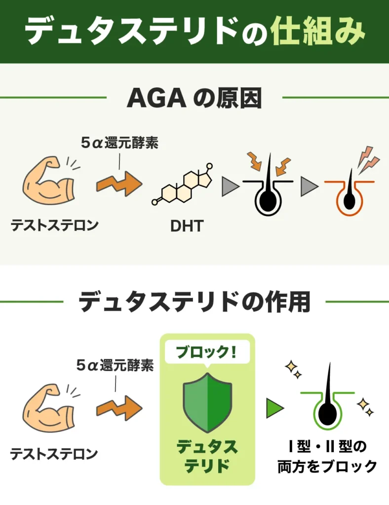 フィナステリドは5α還元酵素のⅡ型を阻害するのに対し、デュタステリドはⅠ型とⅡ型の両方を阻害します。